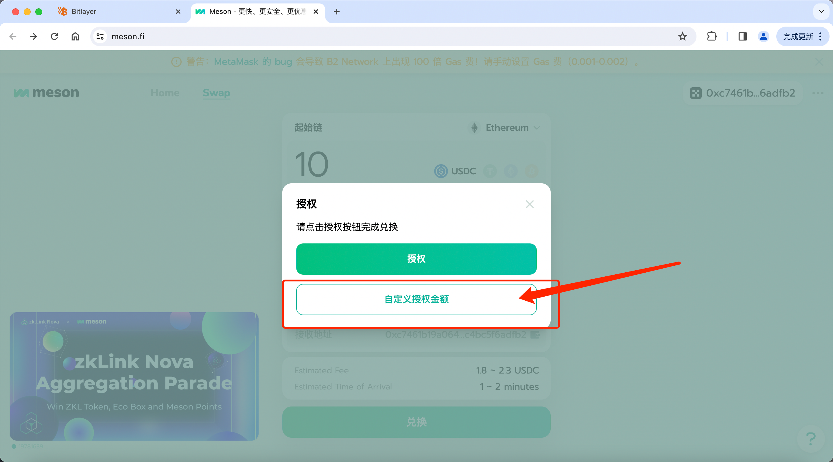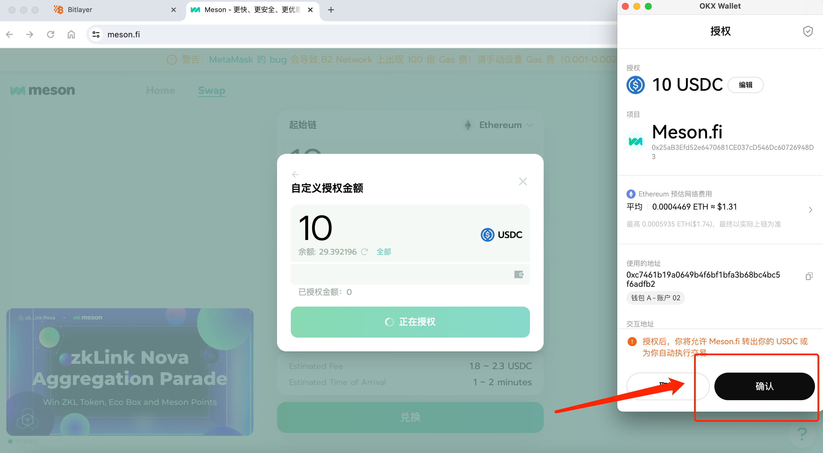 6、点击【自定义授权】,授权数量为本次跨链所需数量,然后在 OKX 钱包授权页面点击【确认】