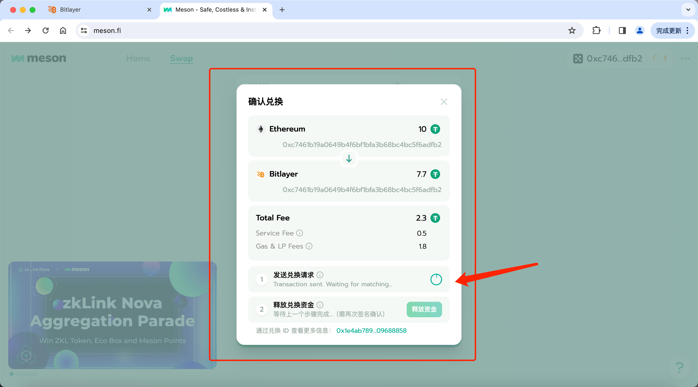 8、此刻,需要等待一下 Meson 的【发送兑换需求】