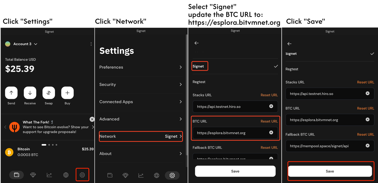 用户可以按照以下图示,在Xverse Wallet中手动设置Signet BTC URL:https://esplora.bitvmnet.org
