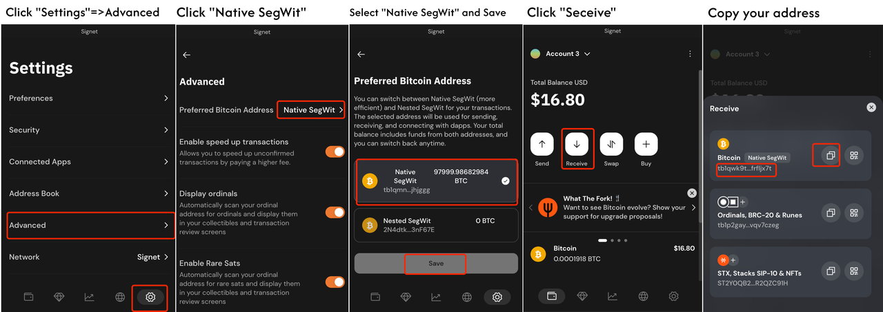 在Xverse wallet中获得Native SegWit的测试地址