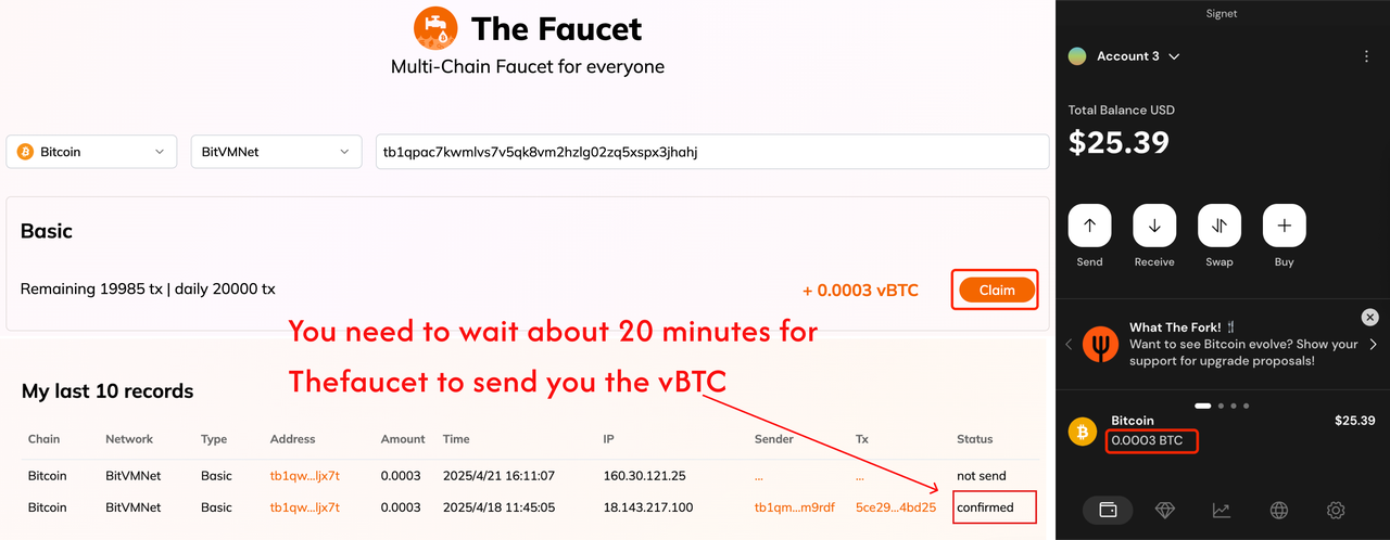请登录多链水龙头 The Faucet 获取相应的BitVMNet测试币vBTC。