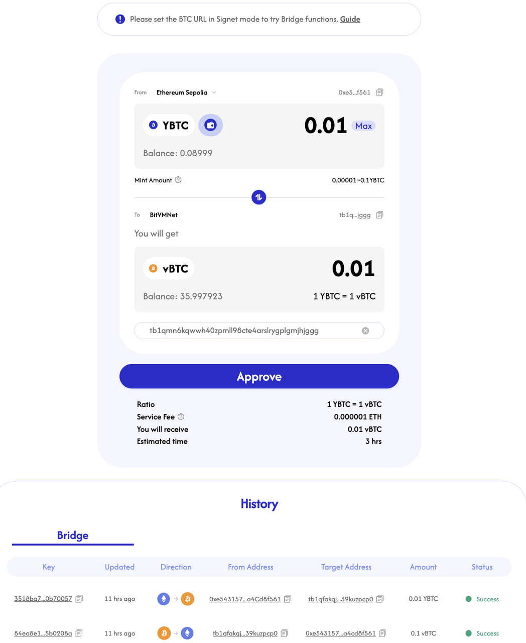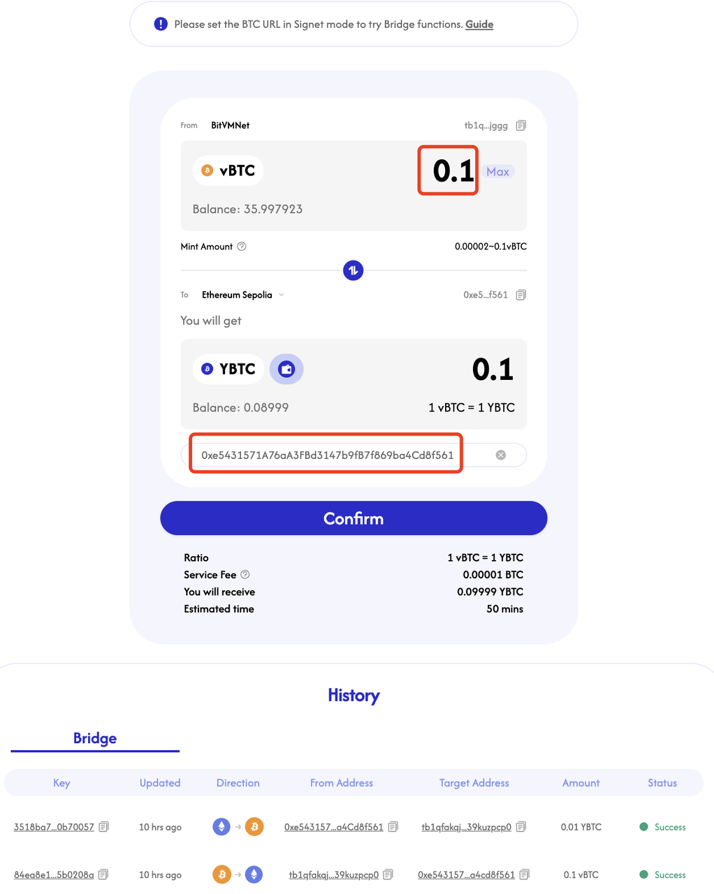 按照页面提示,请输入相应的金额与目标地址,并确认在目标链上桥接相应的YBTC。