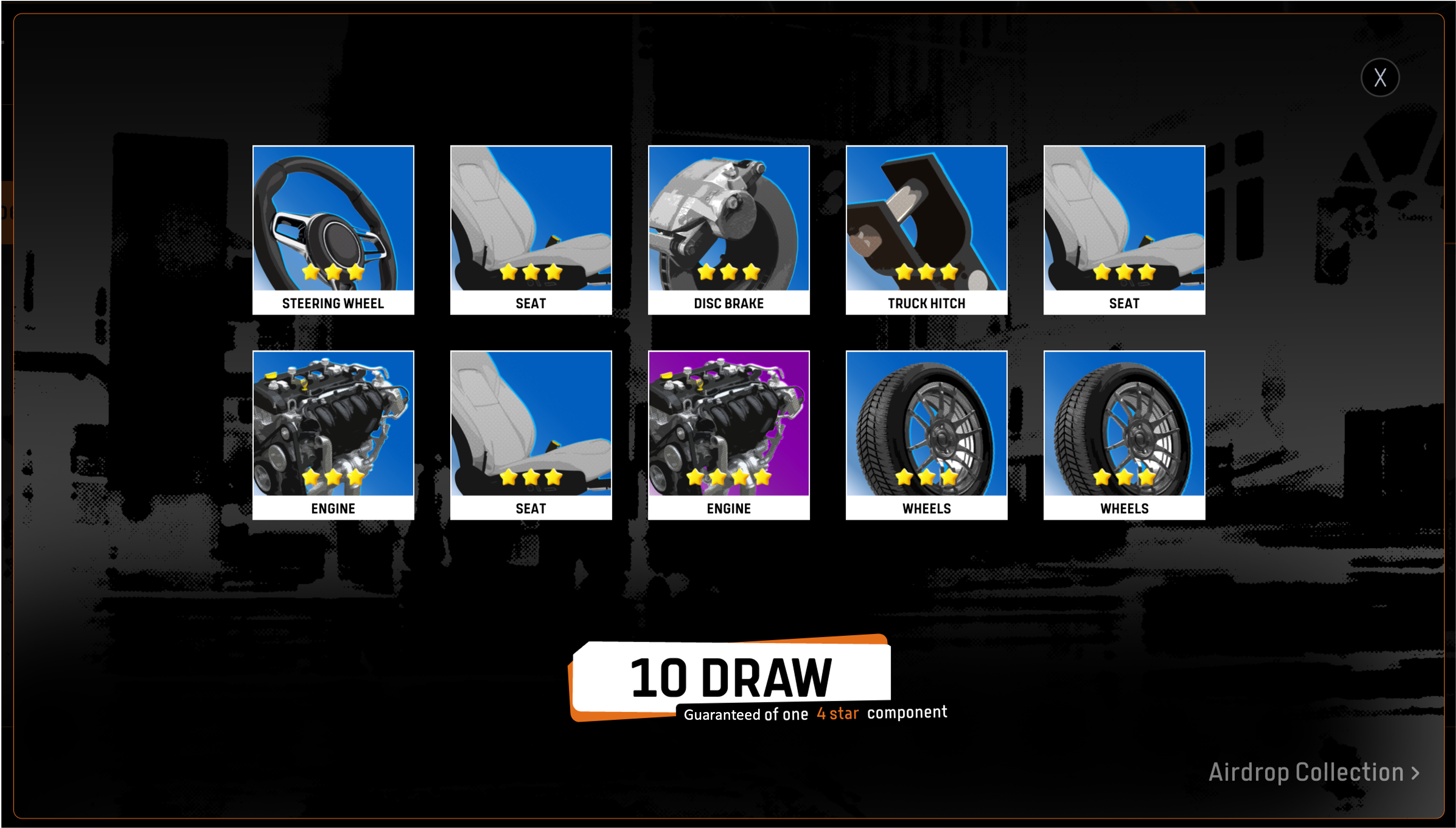 - 玩家可以选择单次抽取或者十连抽的模式进行翻卡操作,使用连抽将有更高概率获得高星级组件,更快合成高星级赛车;