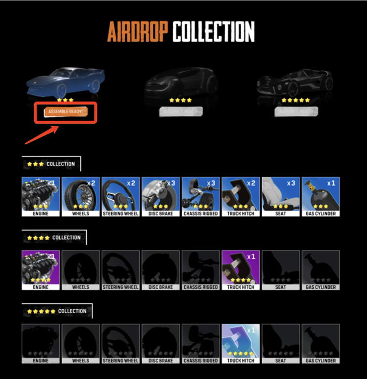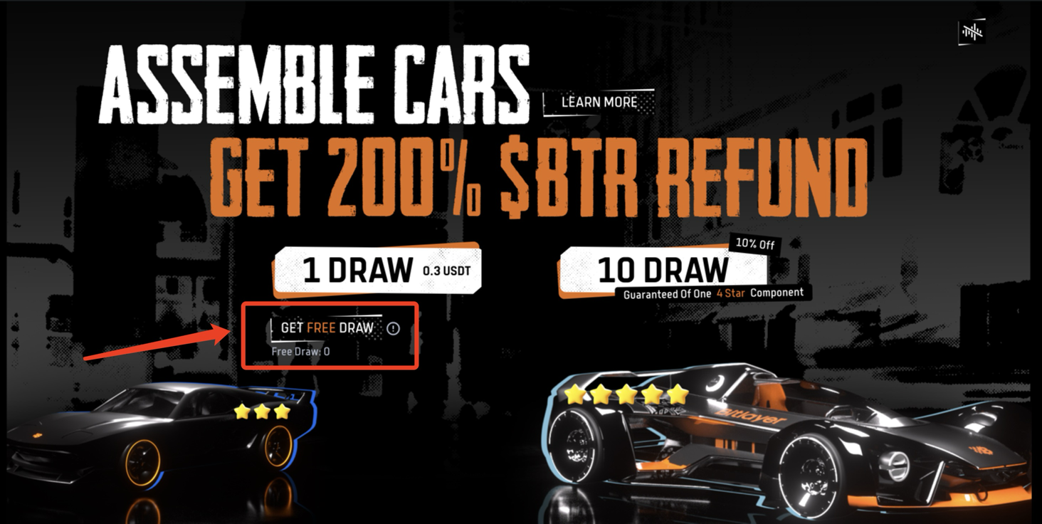 - 赛车分为三类星级(3 星/4 星/5 星),每类赛车需要 8 种对应星级的组件,玩家集齐同星级全部组件后可以组合成一辆对应星级的赛车。未来 TGE 后,玩家将获得对应数量的$BTR 空投,赛车级别越高,空投越多;