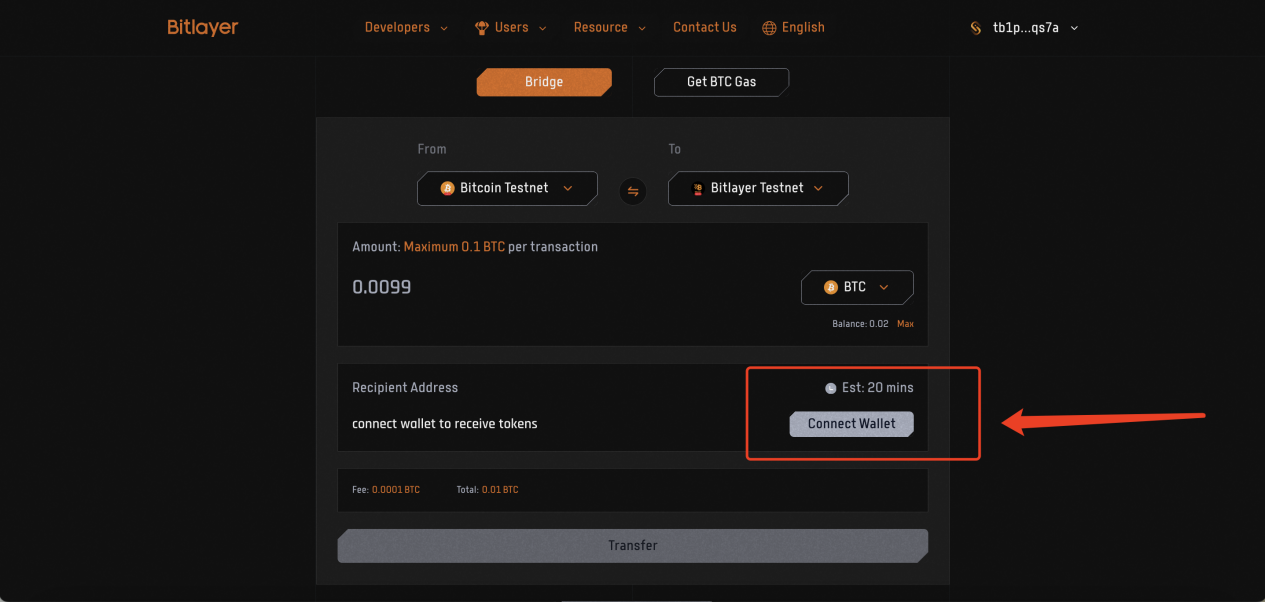4. After linking the wallet, enter the amount of BTC you want to cross over to Bitlayer.