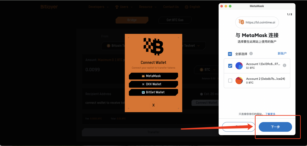 (Note: The transfer amount in this example is 0.00011 BTC, which is for the testing environment and should not be used as a reference. The actual minimum cross-chain amount on Bitlayer is 35 USDT, which is about 0.0003 BTC.)
