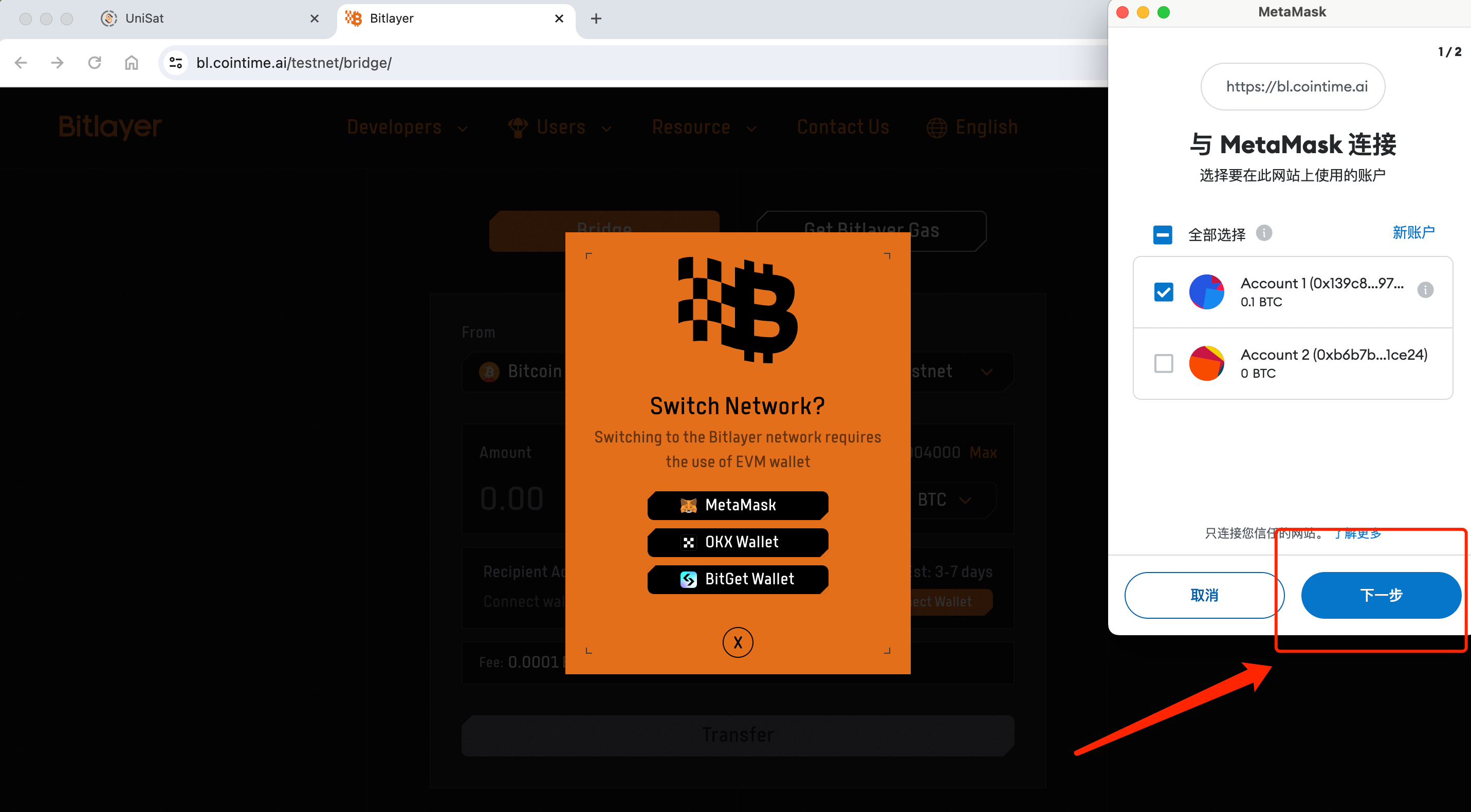 3.  After setting the origin network to Bitlayer, you’ll be prompted to select an EVM wallet. It’s important to use the wallet you previously used when crossing to BTC.