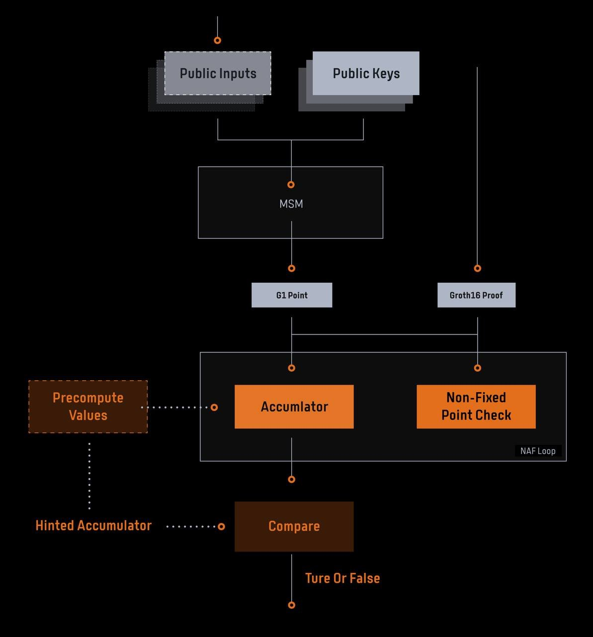 (2) Modular design. Manual chunker carefully divides the monolithic verifier script into logical parts, including MSM, G2 group non-fixed point checking, Miller loop accumulating (for hint comparison). For the chunks of each logical part, only minimal inputs and outputs are hashed and committed.