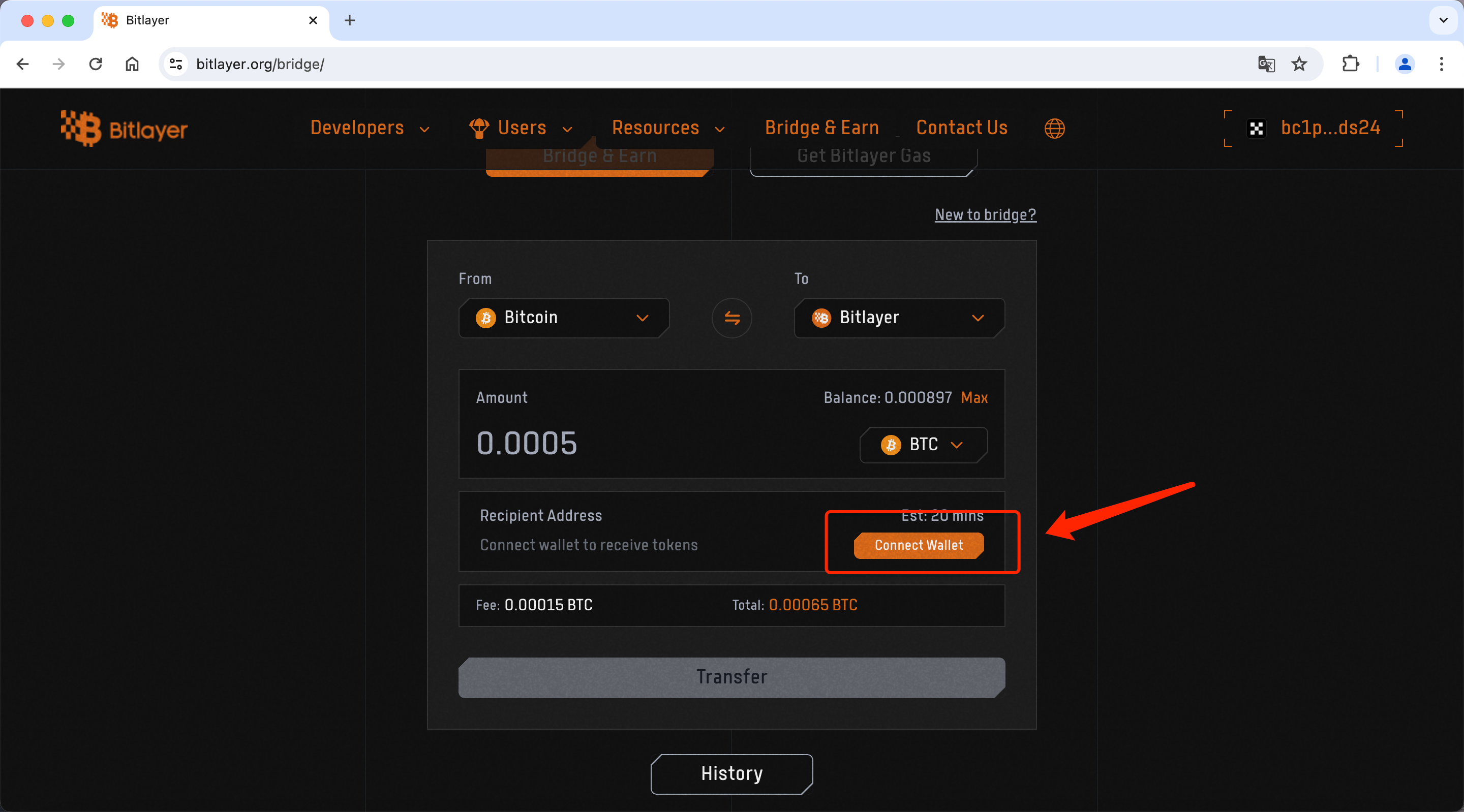 4、链接完钱包之后,输⼊您想跨⼊ Bitlayer 的 BTC 数量。此处提醒您注意查看⼀下您的 BTC 余额是否同时满足以下要求:
