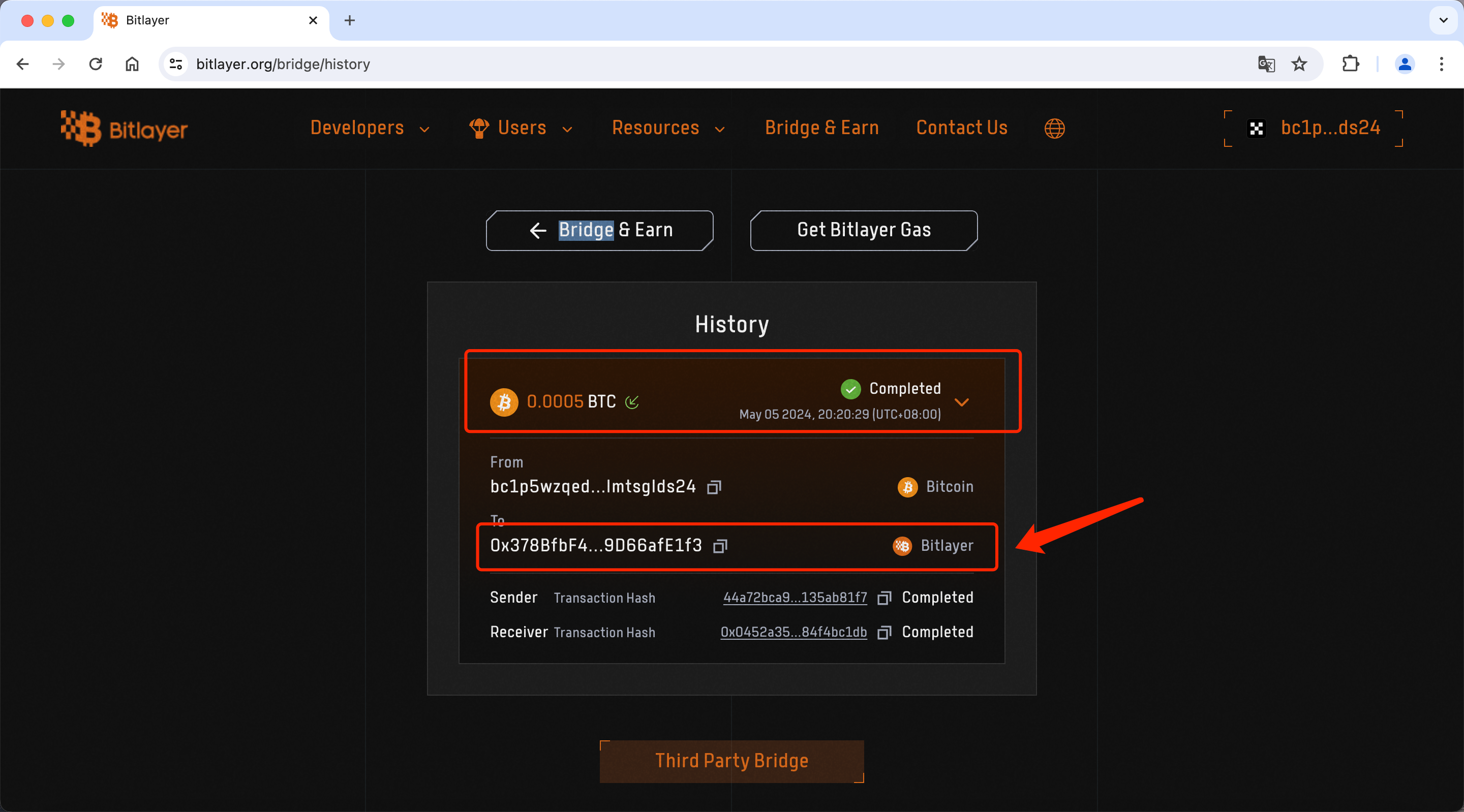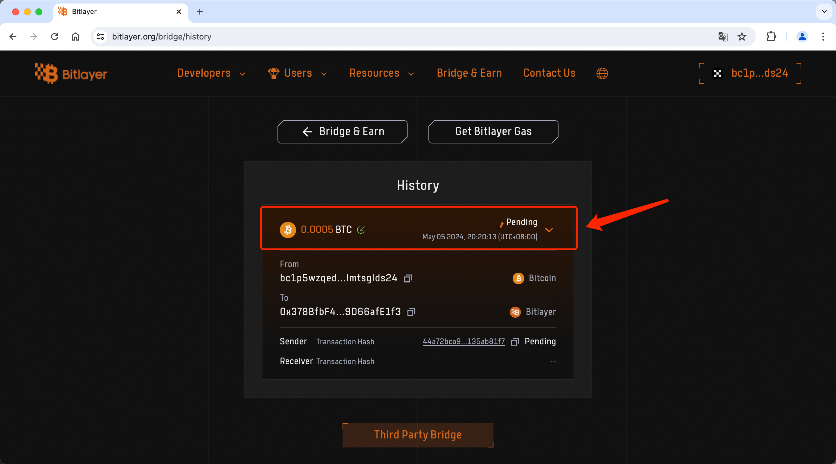 9、签名后将会跳出您的账单,【Pending】表示这笔跨链还在链上处理过程,此时间长短取决于链上拥挤程度,当出现【Completed】,则表示您已经成功跨链,箭头处则是您在 Bitlayer 上面的 BTC 地址。