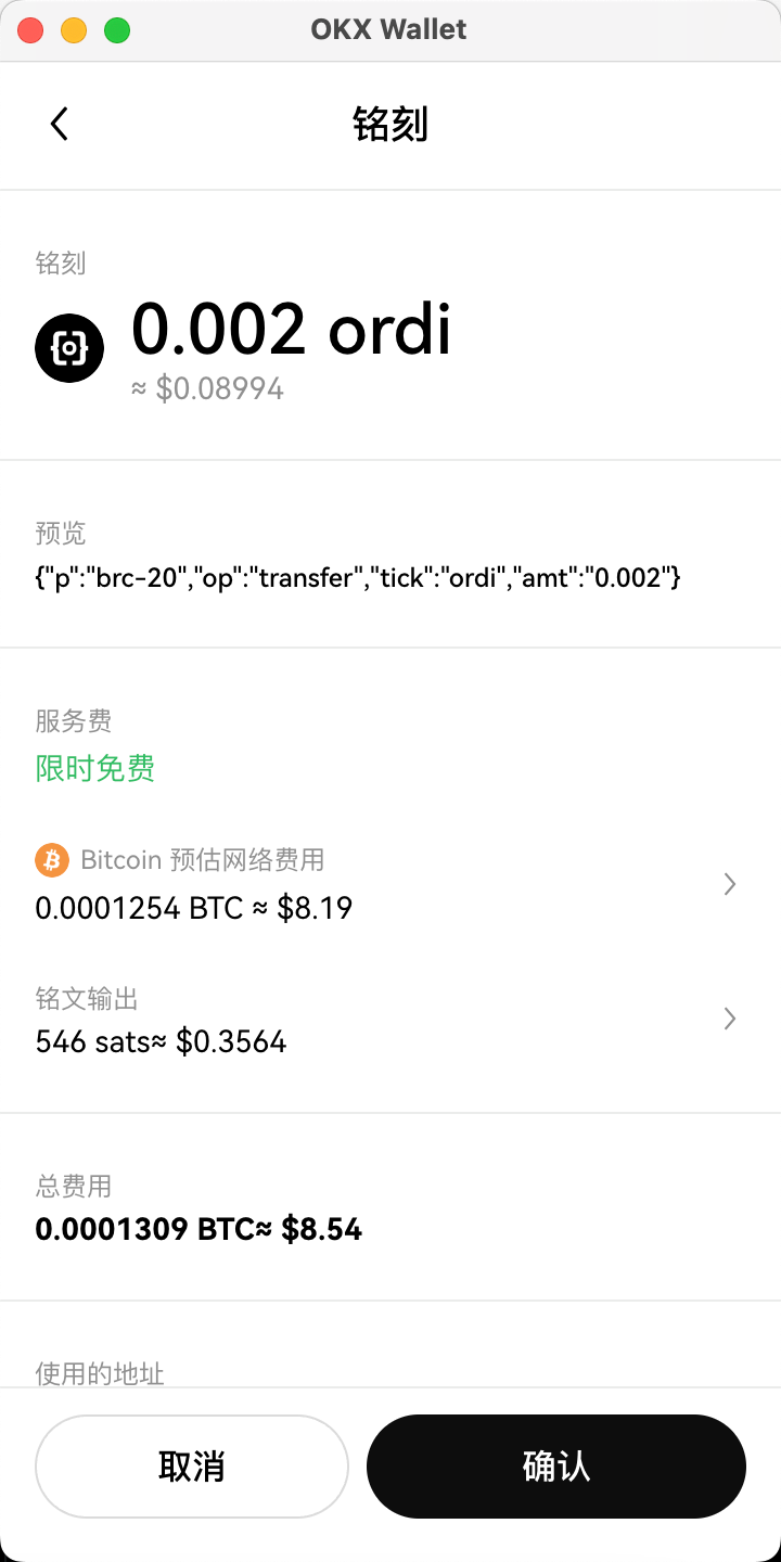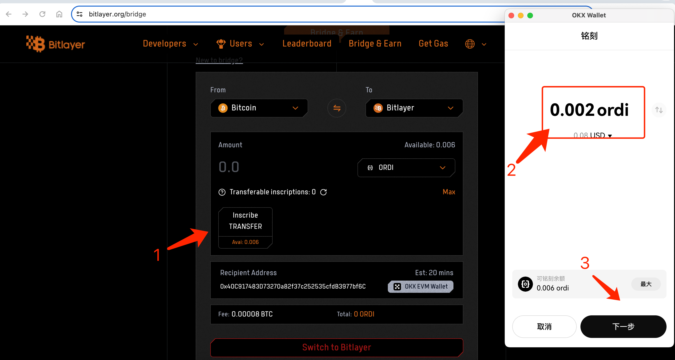 2. 区别与其它协议 token 的转账(跨链),brc20 资金需要先铭刻期望转账资产的数量,即点击【Inscribe TRANSFER】,随即在弹出的钱包页面,输入您想铭刻的铭文数量