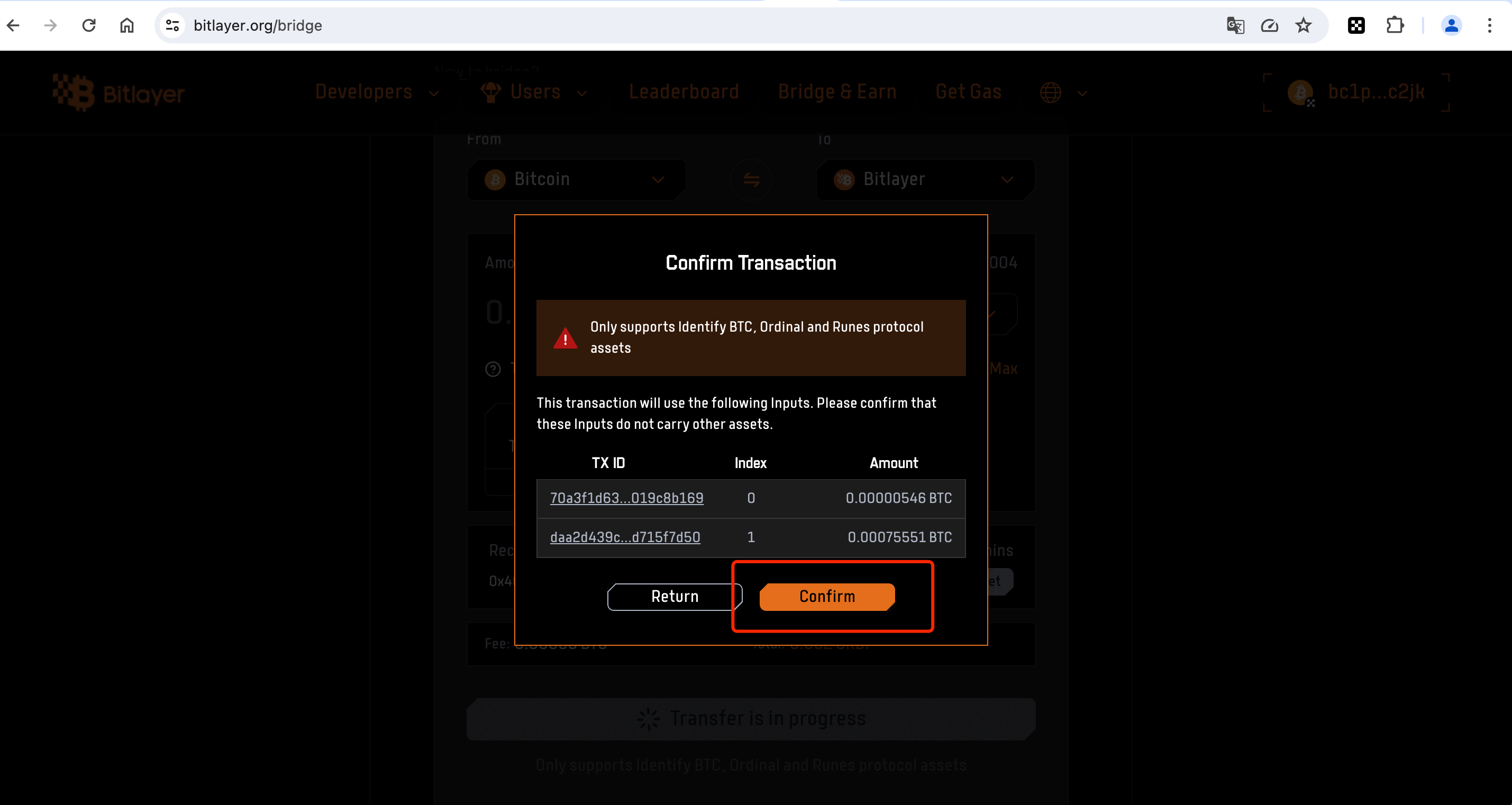 5. 目前 Bitlayer 跨链,仅支持识别 BTC、Ordinal、Runes 协议资产,跨链时请确认 Inputs 未携带其它协议资产,否则您的资产将会受损,确认无误后,点击 Confirm,而后在钱包中再确认即可