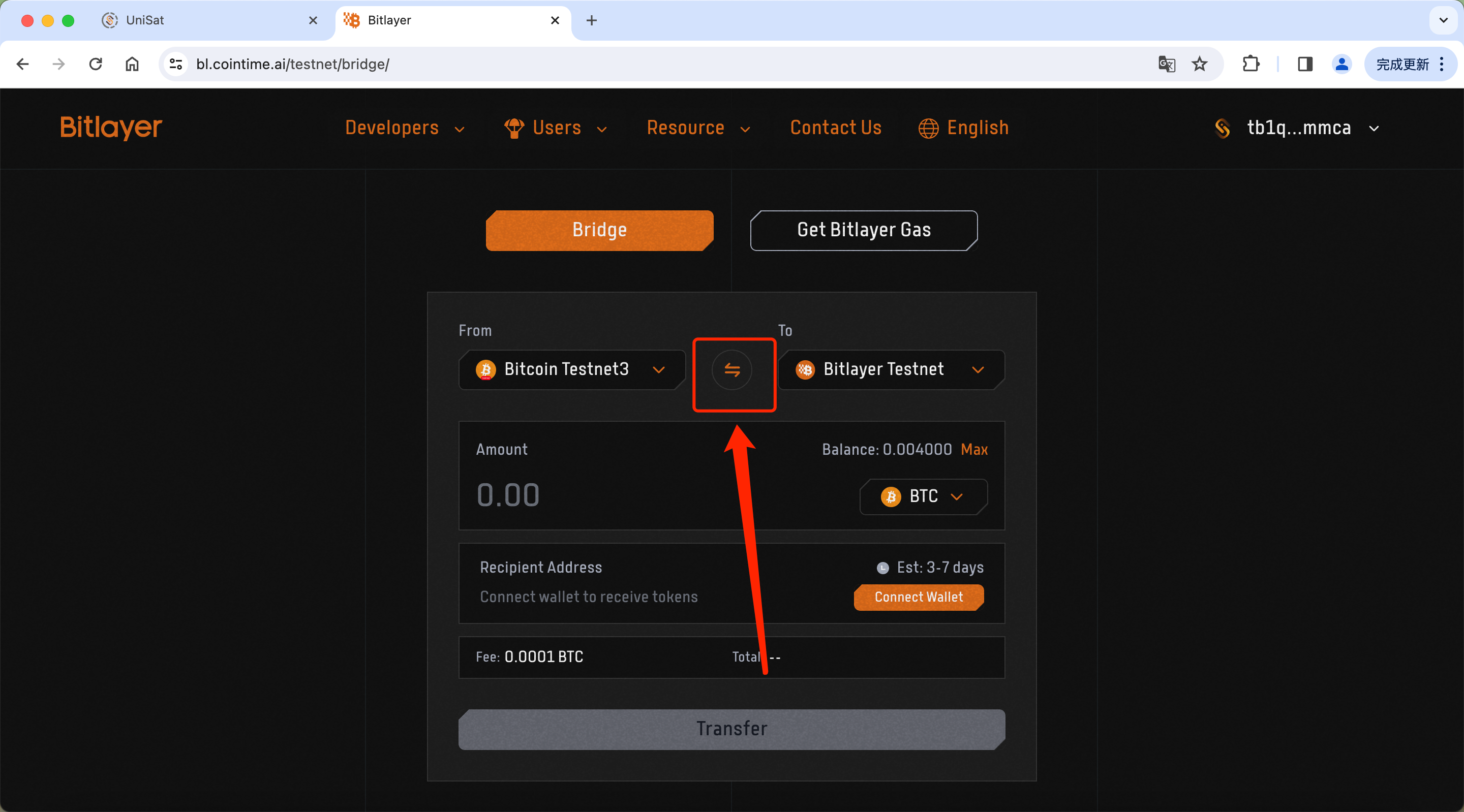 2.  Note that by default, the website will show “Bitcoin” crossing to “Bitlayer,” so you’ll need to click on the arrows between those two options to toggle which direction you want your transaction to go.