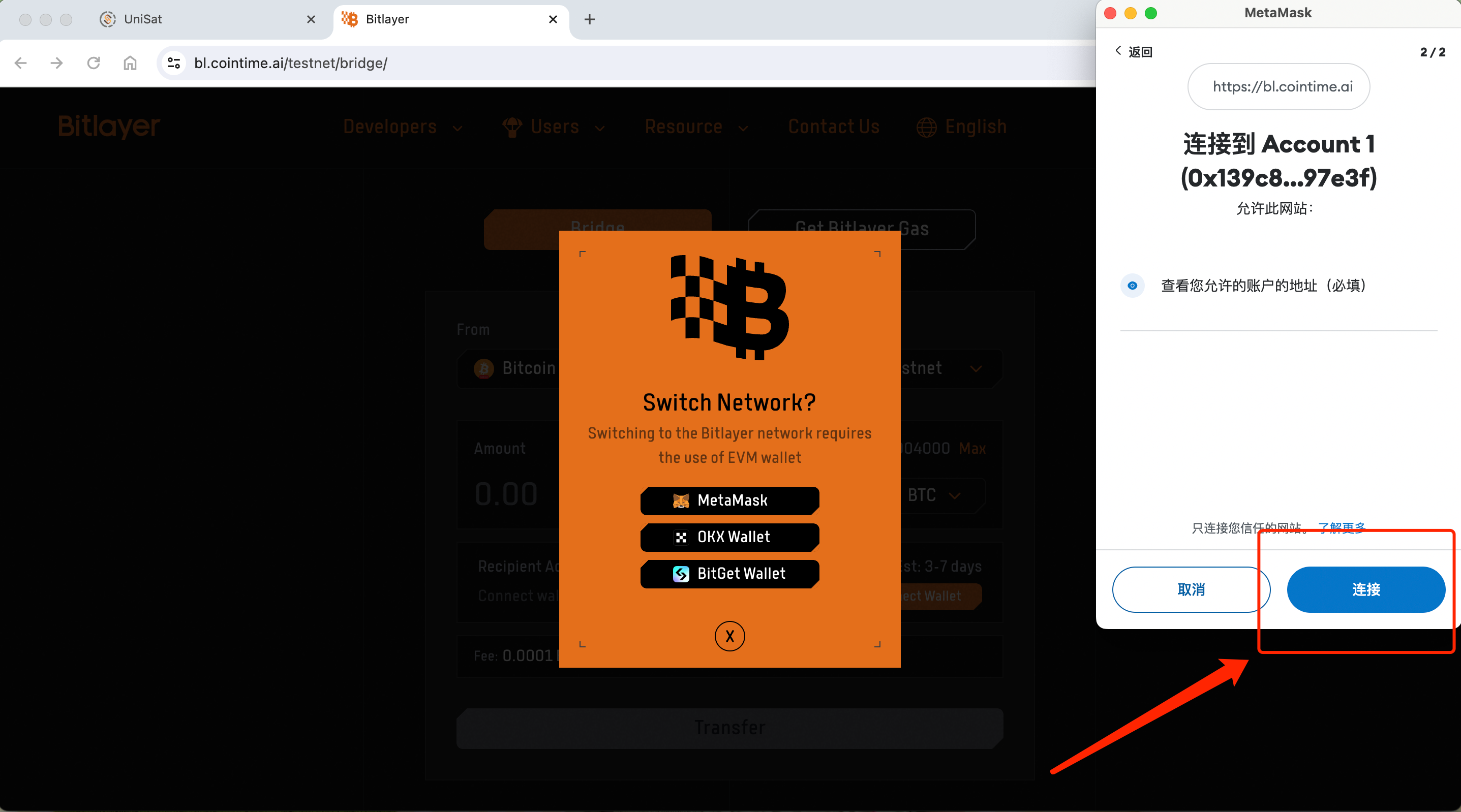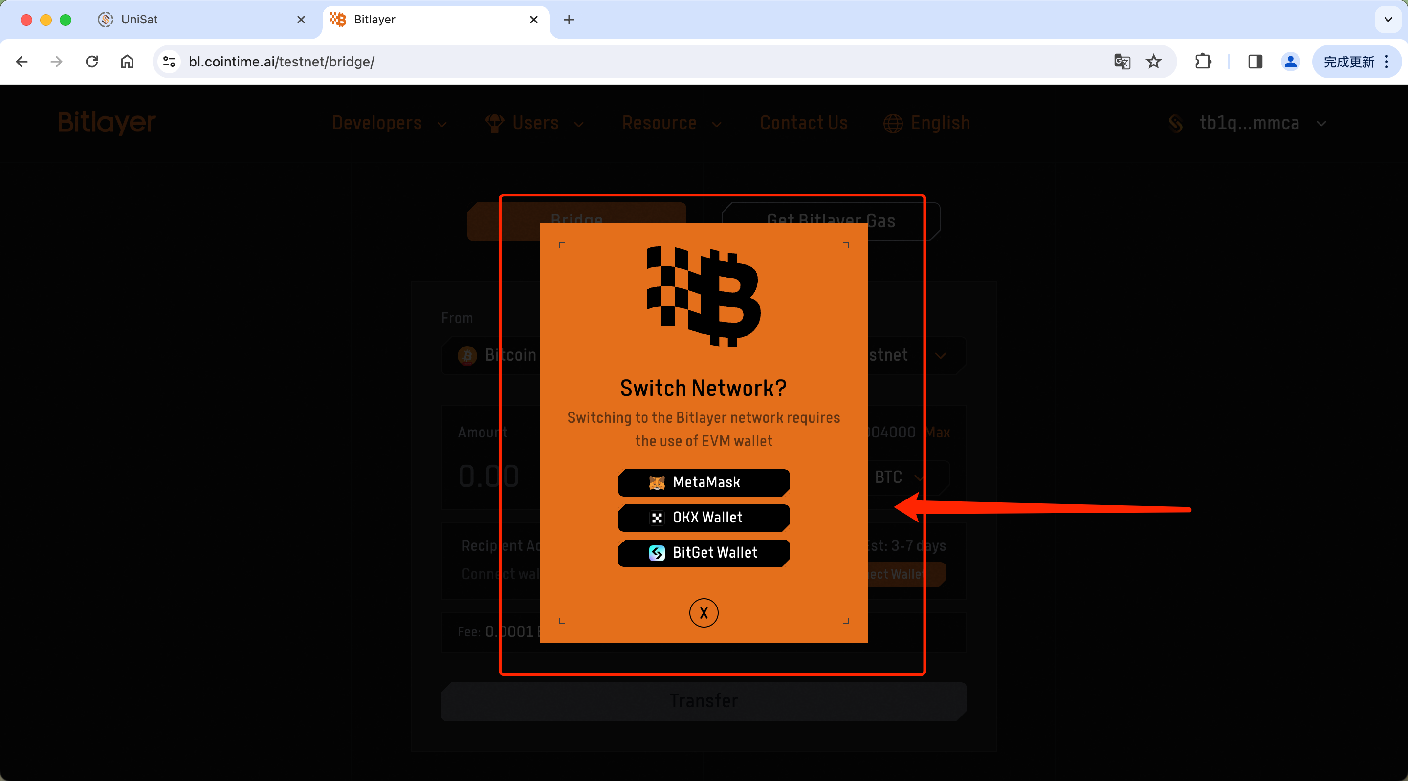 3.  After setting the origin network to Bitlayer, you’ll be prompted to select an EVM wallet. It’s important to use the wallet you previously used when crossing to BTC.