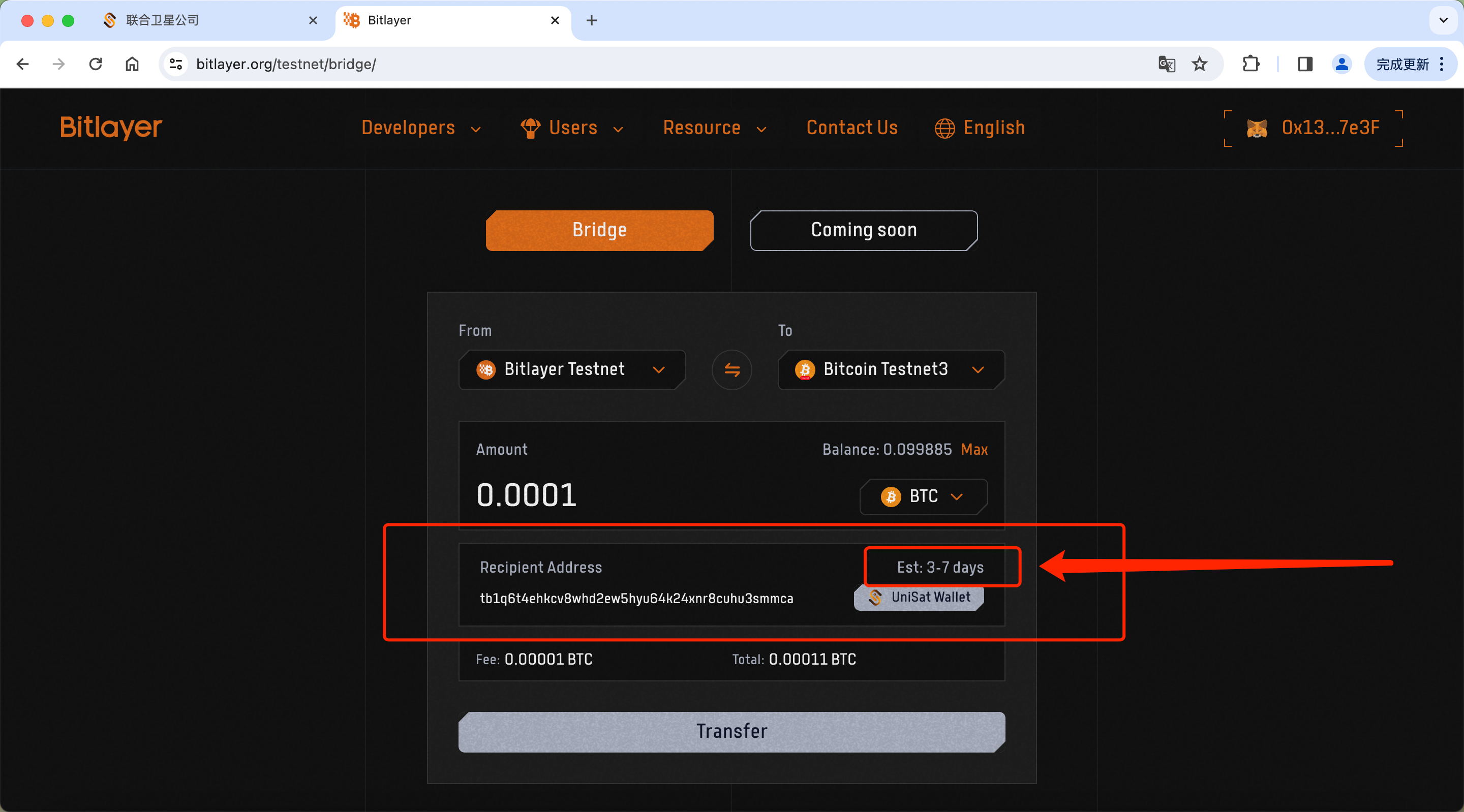 6.  At this point, you’ll be directly connected to your Unisat Wallet. However, please note that Bitlayer will adopt bitvm in the V2, an optimistic system that requires sufficient time to commit the transaction, access the data availability layer, wait for challenges, and settle any potential slashings among other processes. Thus, the approximate time it will take to cross using Bitlayer’s official bridge is 3–7 days.