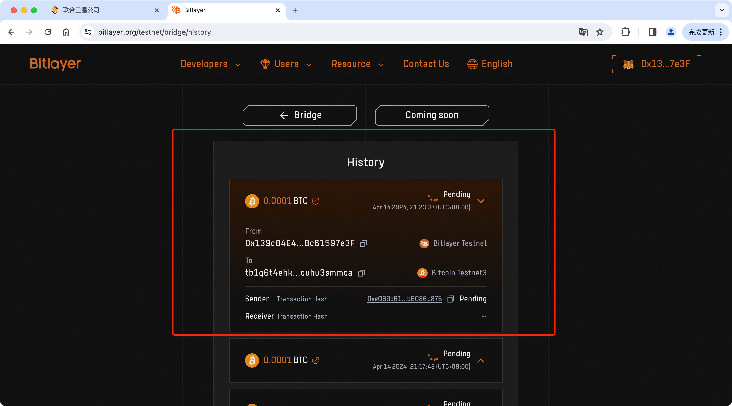 8.  If you see the page as shown below, it means you have successfully transferred BTC. In 3–7 days, your Unisat Wallet will receive the bridged BTC.