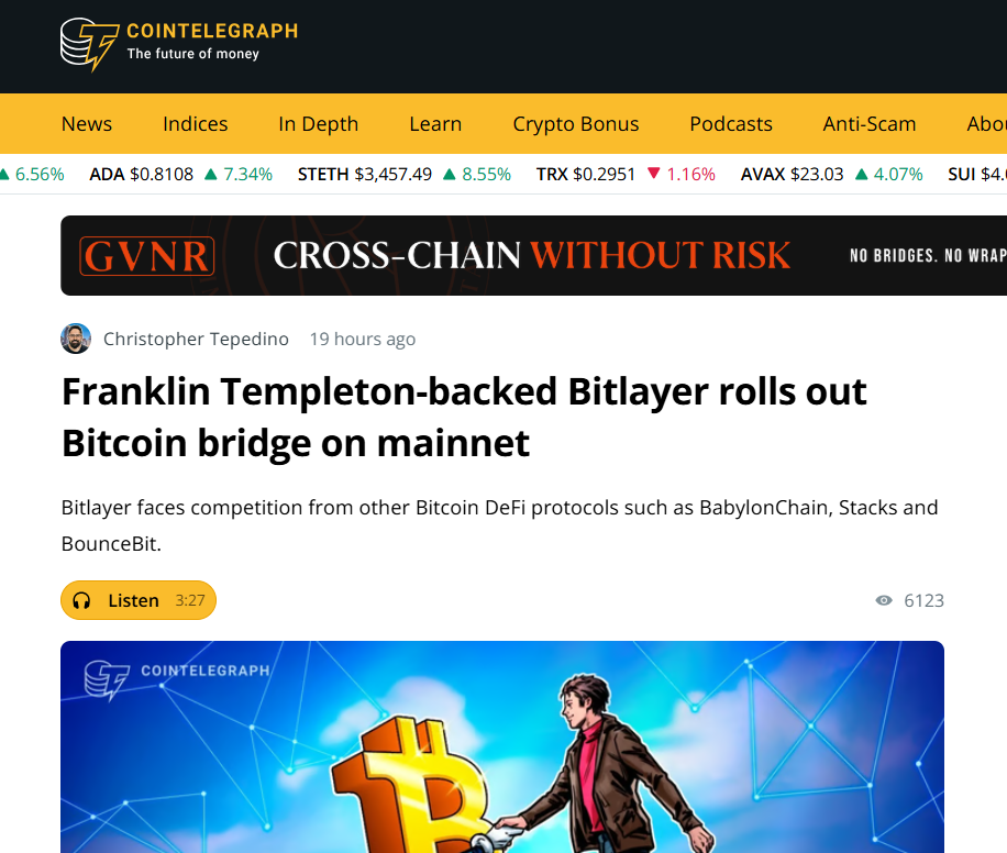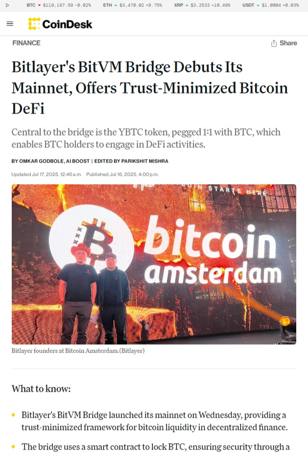 • Cointelegraph Coverage: BitVM Bridge is a “trust-minimized bridging solution for Bitcoin holders.” It enables users to deposit Bitcoin into a smart contract, where it is held in escrow and converted into Peg-BTC (YBTC), a tokenized version of Bitcoin that can interact with smart contract platforms. It is a key infrastructure for Bitcoin DeFi.