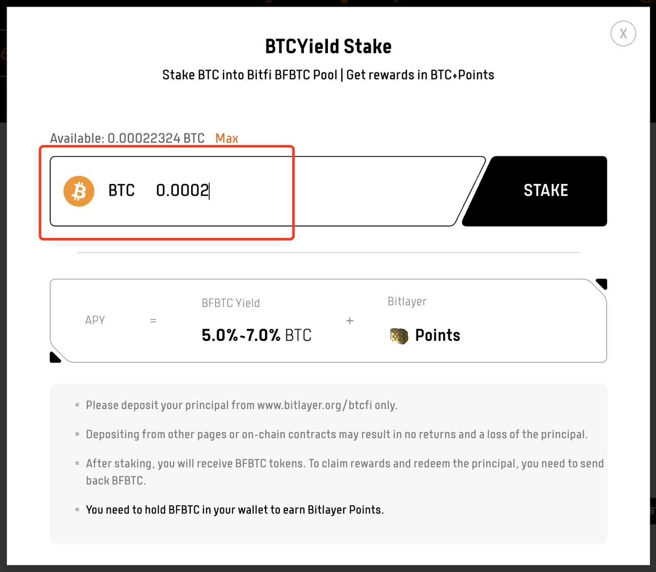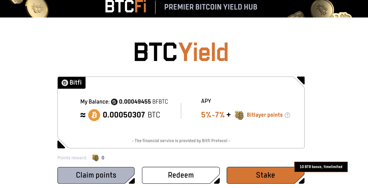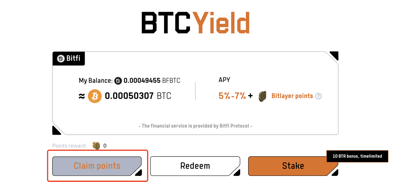 • 用户需在 https://www.bitlayer.org/btcfi 页面进行质押,且在钱包内持有bfBTC期间会产生Bitlayer points奖励,收益需要单独领取。
