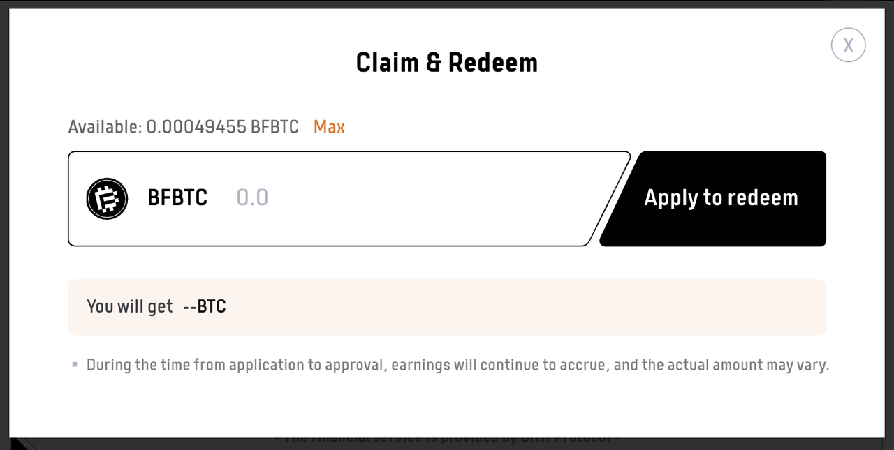 • 领取方式:结算完成后,用户可通过unstake bfBTC领取收益。收益来源于bfBTC与BTC的Ratio变化,Ratio每Epoch(目前为24小时)更新一次,表示1 bfBTC可兑换的BTC数量。